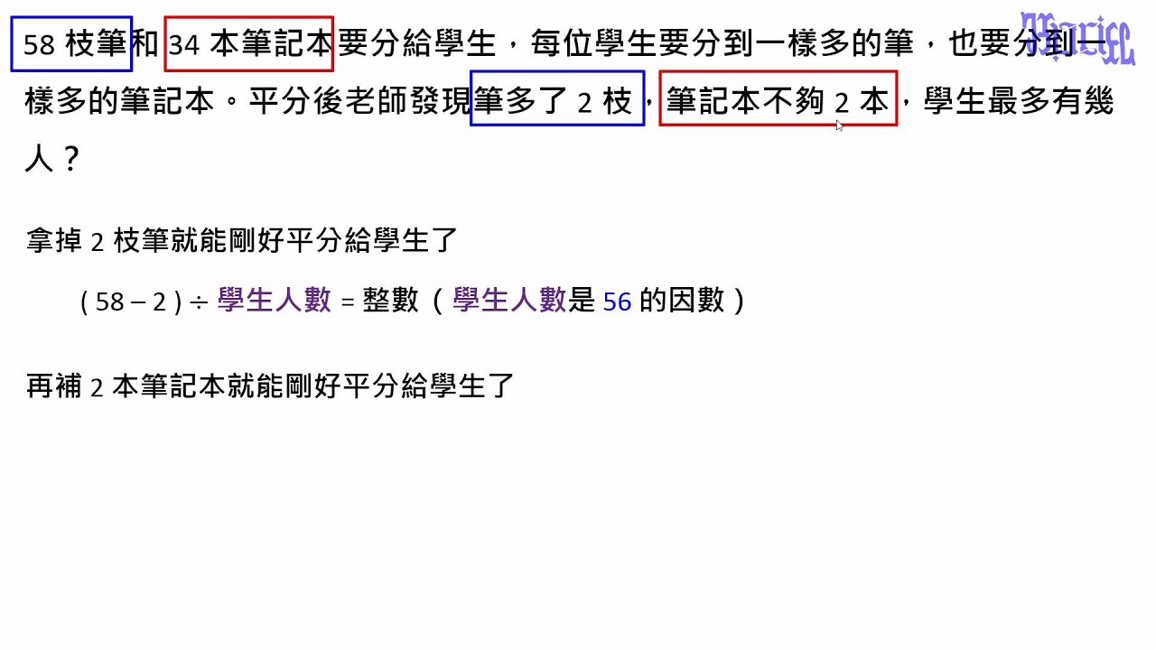 最大公因數及最小公倍數 18 最大公因數題型4 分裝完兩種數量不同的東西還有剩或是不足 Youtube